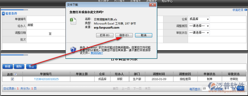 4、選中需要導(dǎo)出的日常調(diào)整單信息,點(diǎn)擊【導(dǎo)出】即可實(shí)現(xiàn)。如圖: