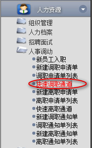 1.點(diǎn)擊辦公模式→行政管理→人事調(diào)動(dòng)→快速調(diào)職通道,進(jìn)入“快速調(diào)職通道”窗口: