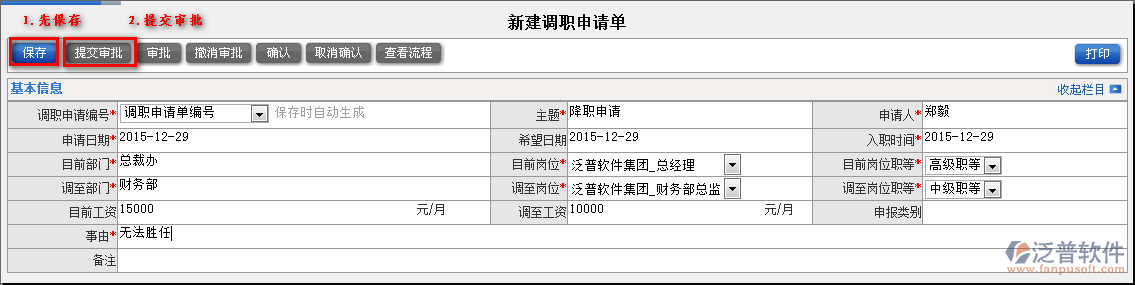 2.填寫調(diào)職的信息,先要保存才能提交審核。