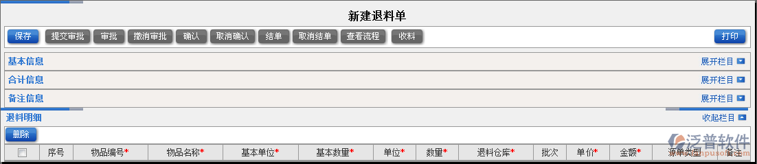2.新建退料單需要填寫退料單基本信息、合計(jì)信息、備注信息、退料明細(xì)