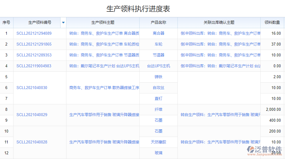 1、泛普ERP自動匯總所有生產(chǎn)領(lǐng)料單對應(yīng)的關(guān)聯(lián)的物料出庫和使用情況。