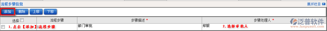 2.填寫流程名稱,使用部門范圍,是否短信提醒等,最后進(jìn)入流程步驟設(shè)置。點(diǎn)擊【添加】