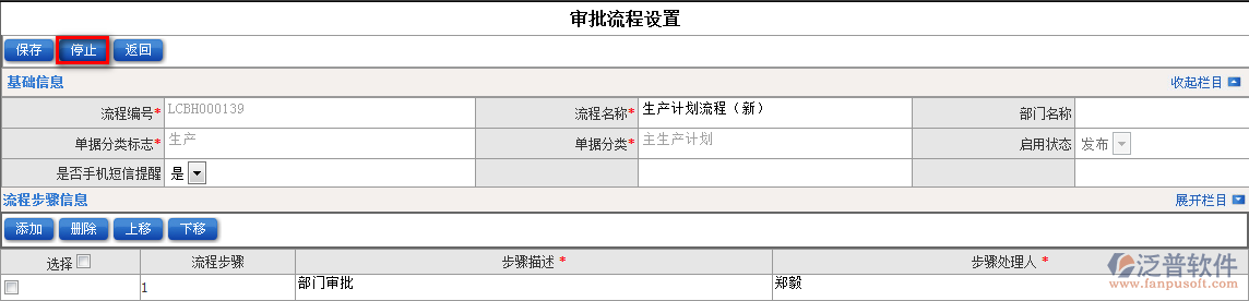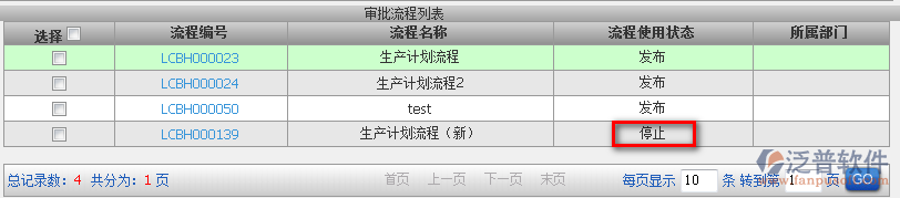 3.如何取消已經(jīng)發(fā)布的流程?進(jìn)入此界面點(diǎn)擊【停止】即可(流程使用狀態(tài)也顯示為停止)