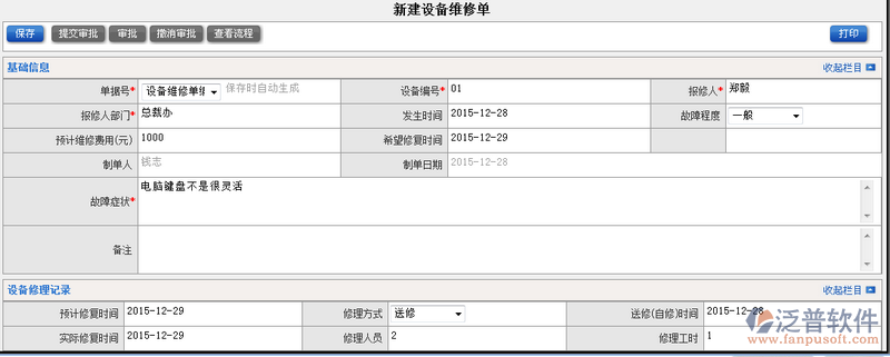 5、新建設備維修單提供用戶直接【打印】實現(xiàn)在線打印