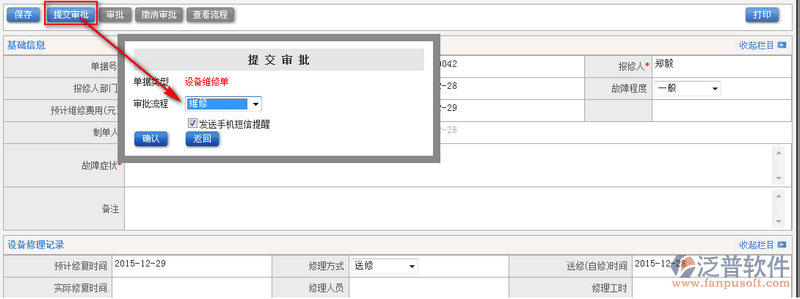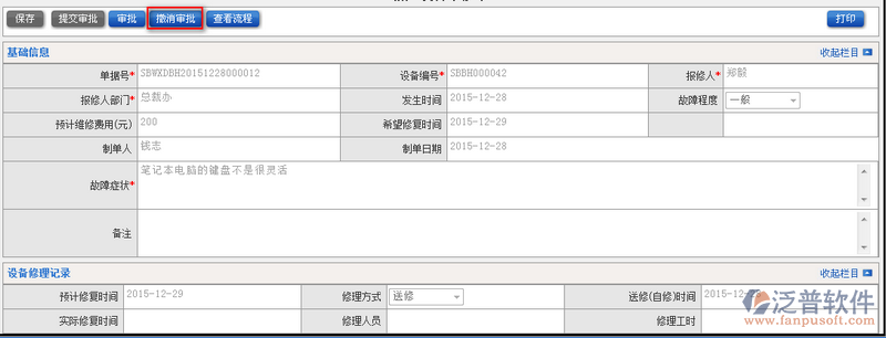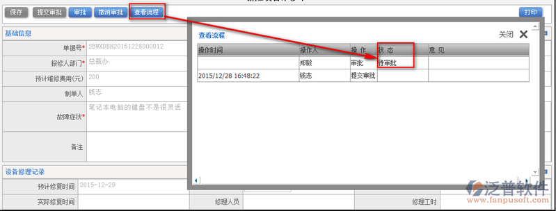 2、填寫完相關(guān)的設備維修信息,即可點擊【提交審批】進入工作流程的審批狀態(tài)。審批通過的設備維修單才能進行一個正常的維修過程