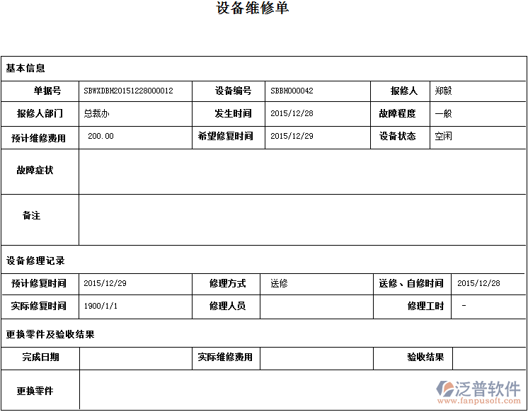 設備維修單主要對公司設備進行維護,當員工領用的設備發(fā)生損壞時,就可使用【設備維修單】進行維護或者換新操作。設備維修單填寫內(nèi)容主要包括:單據(jù)號、設備編號、報修人、故障癥狀、故障程度等相關(guān)的重要信息,方便后期在維護中能快速了解損壞的部位。