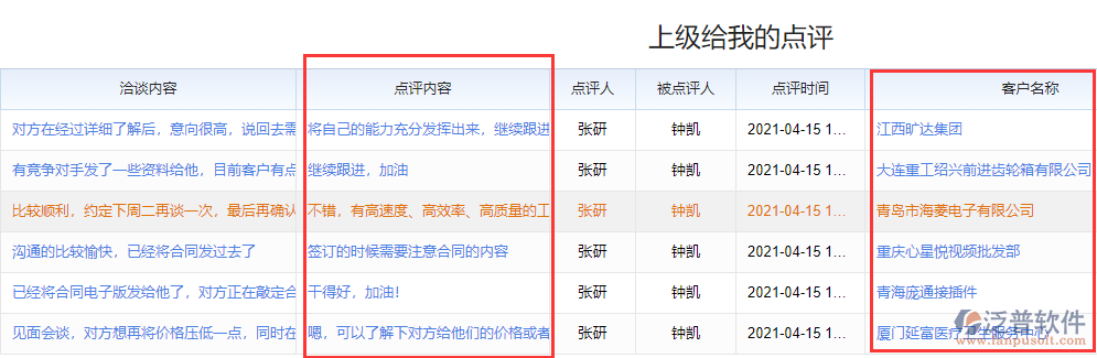 3、每次點(diǎn)評(píng)的時(shí)候點(diǎn)評(píng)內(nèi)容都會(huì)和相應(yīng)的客戶以及哪個(gè)跟進(jìn)詳情進(jìn)行關(guān)聯(lián),這樣能直觀的體現(xiàn)出來(lái)銷售經(jīng)理是針對(duì)哪次的客戶跟進(jìn)進(jìn)行的點(diǎn)評(píng)