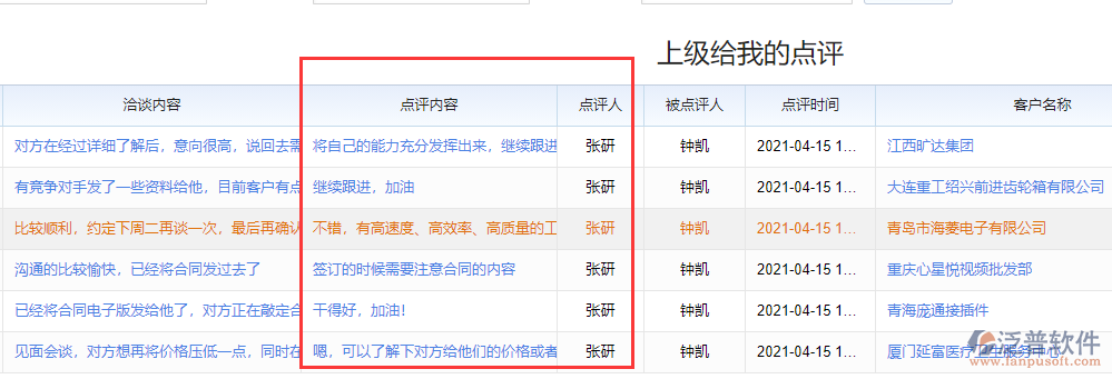 1、當(dāng)銷售經(jīng)理給銷售人員進(jìn)行客戶跟進(jìn)點(diǎn)評(píng)后,系統(tǒng)會(huì)自動(dòng)生成一張表,在當(dāng)前這張表中可以查看每次銷售經(jīng)理對(duì)銷售員的點(diǎn)評(píng)內(nèi)容和時(shí)間,也能為銷售員的業(yè)績(jī)?cè)u(píng)估作為一定的依據(jù)