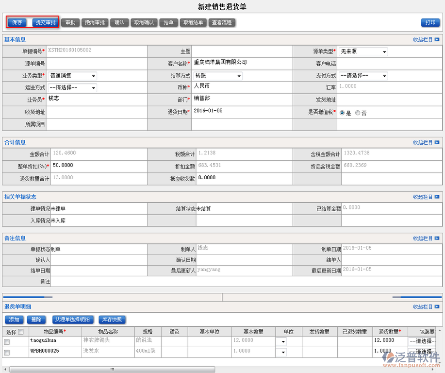 2、填寫完退貨單中的詳細(xì)信息,點(diǎn)擊【保存】后便可實(shí)現(xiàn)【提交審批】功能。如圖: