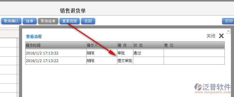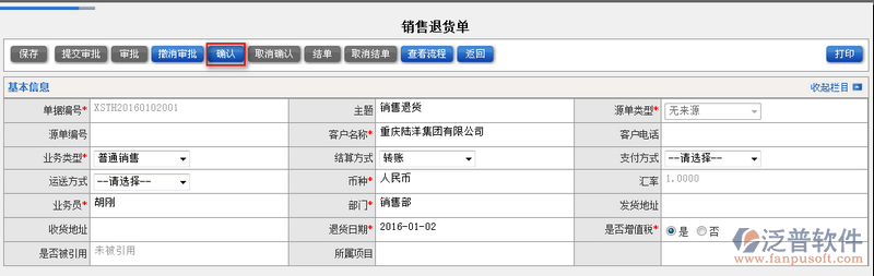 3、審批通過的退貨單用戶可對其進(jìn)行確認(rèn)操作,點(diǎn)擊【確認(rèn)】即可對審批的退貨進(jìn)行確認(rèn)操作。如圖: