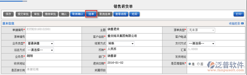 4、確認(rèn)后的銷售退貨單便可對其進(jìn)行退貨操作,退貨成功的貨便可對其進(jìn)行【結(jié)單】操作。如圖: