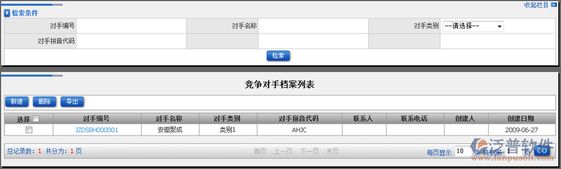 上一節(jié)我們講到如何創(chuàng)建新的競爭對手檔案。這一節(jié)我們主要講解創(chuàng)建好的競爭對手檔案存放。在【競爭對手檔案列表】中可以通過系統(tǒng)提供的檢索條件進行模糊查詢。其中檢索條件包括:對手編號、對手名稱、對手類別、對手拼音代碼等相關(guān)條件進行檢索。