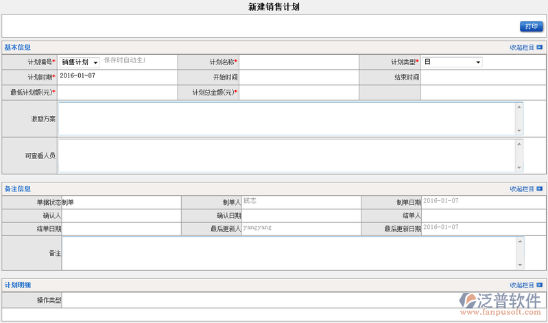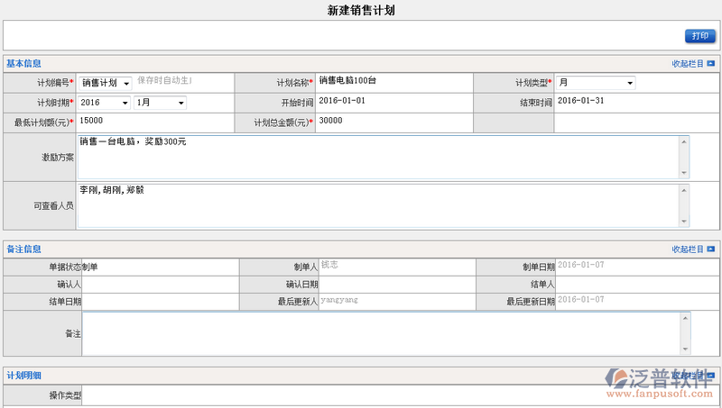 3、在新增銷售計劃頁面,ERP系統(tǒng)為企業(yè)用戶提供打印功能,點擊【打印】進入銷售計劃打印頁。如圖: