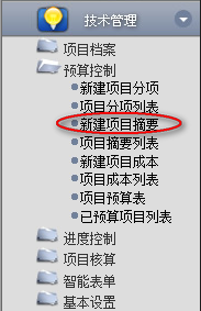 1.點擊辦公模式→技術(shù)管理→預(yù)算控制→新建項目摘要,進入“新建項目摘要”窗口: