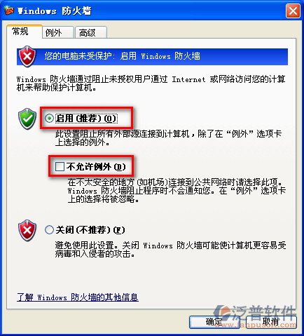 打開(kāi)“Windows防火墻”設(shè)置界面,在“常規(guī)”標(biāo)簽啟用防火墻(為了網(wǎng)絡(luò)和系統(tǒng)安全),取消“不允許例外”前面的勾,如下設(shè)置:
