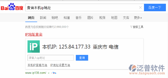 在百度或其他搜索引擎上輸入查詢(xún)本機(jī)IP地址,如下所示顯示的就是外網(wǎng)的IP地址。如果是要用外網(wǎng)訪(fǎng)問(wèn)OA,則用如下地址。192.168.xx.xx為內(nèi)網(wǎng)地址,只能用于內(nèi)網(wǎng)訪(fǎng)問(wèn)。