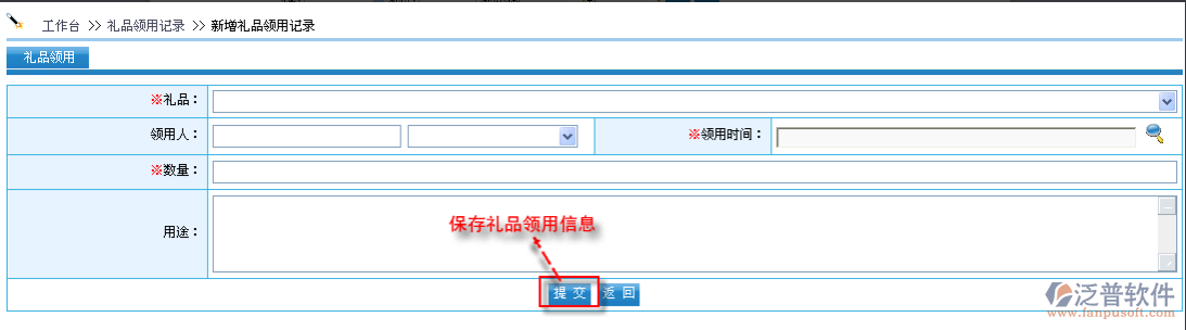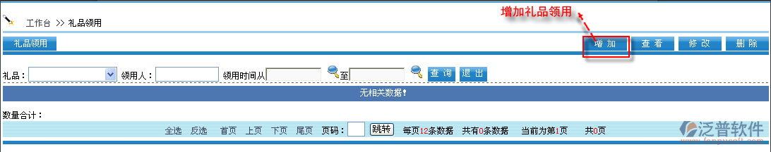 首先進(jìn)入到【銷(xiāo)售系統(tǒng)】—【市場(chǎng)管理】—【禮品管理】—【禮品領(lǐng)用登記】,如圖: