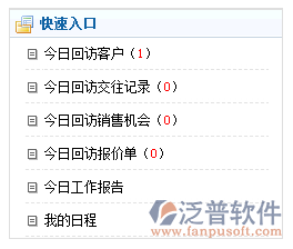 【快速入口】:迅速掌握自己當(dāng)天工作內(nèi)容,可以快速進(jìn)入今日回訪客戶、查詢今日回訪交往記錄、今日可以拜訪的銷售機(jī)會、今天可以做回訪的報價客戶、快速進(jìn)入工作日志的填寫