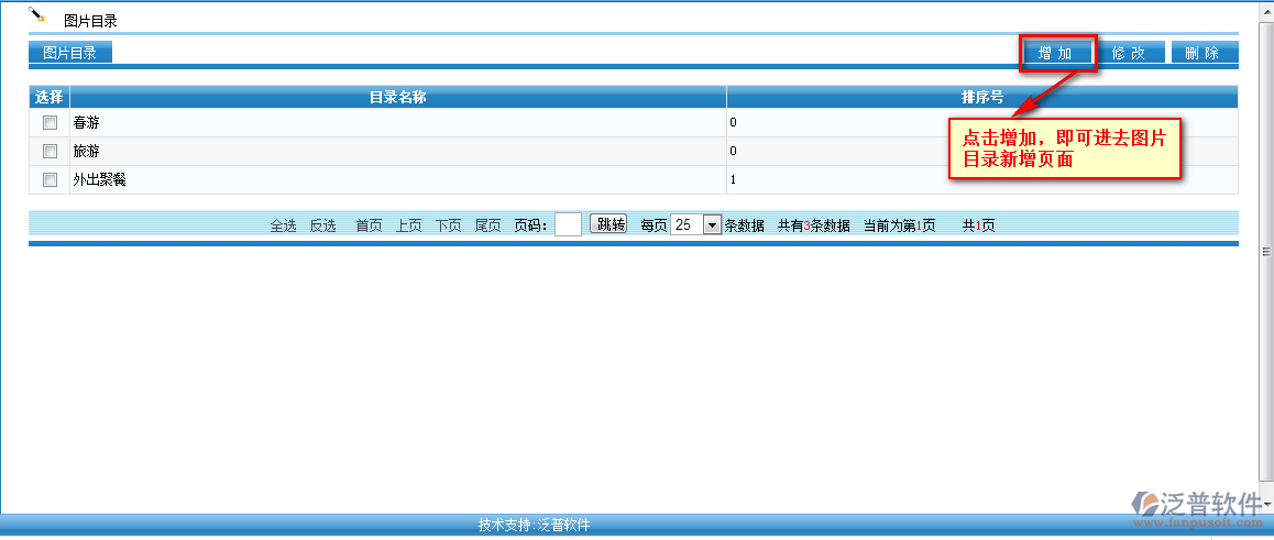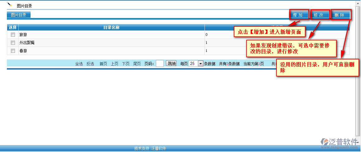 創(chuàng)建好的圖片目錄全部以列表的形式顯示,再此頁面可以直接新增、刪除、修改。