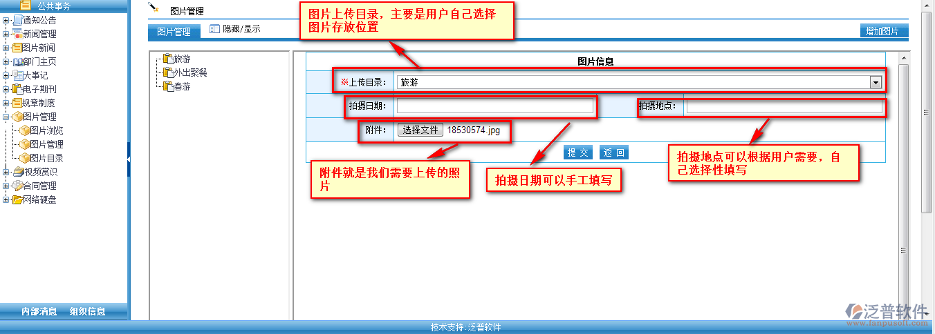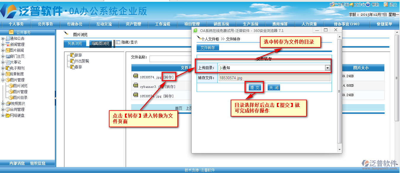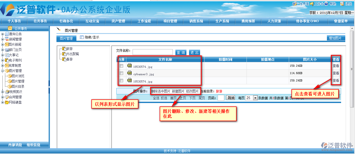 OA系統(tǒng)圖片管理相當(dāng)于員工、部門、公司的一個(gè)相冊(cè)管理。在圖片管理中我們需要先設(shè)置好圖片存放的目錄。詳細(xì)請(qǐng)查看《新增圖片目錄》