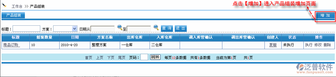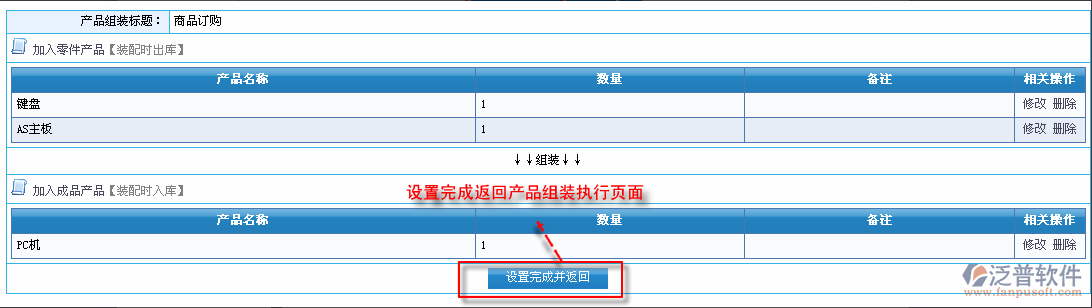 新增完明細(xì)以后,點(diǎn)擊【設(shè)置完成并返回】返回組裝列表,然后點(diǎn)擊此行數(shù)據(jù)后的【執(zhí)行】進(jìn)入組裝確定頁面