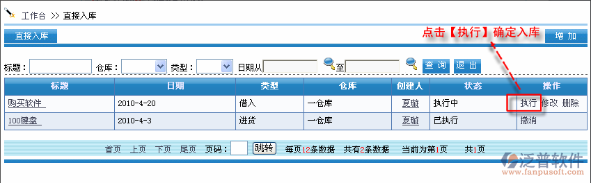 新增完明細(xì)以后,點(diǎn)擊【設(shè)置完成并返回】返回入庫(kù)列表,然后點(diǎn)擊此行數(shù)據(jù)后的【執(zhí)行】則入庫(kù)完成,如圖:
