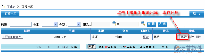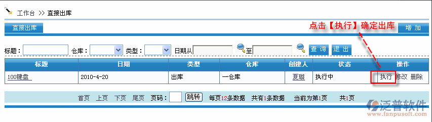 新增完明細(xì)以后,點(diǎn)擊【設(shè)置完成并返回】返回出庫(kù)列表,然后點(diǎn)擊此行數(shù)據(jù)后的【執(zhí)行】則出庫(kù)完成,如圖: