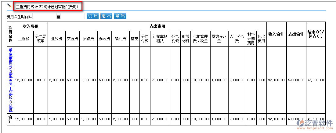 工程費用統(tǒng)計:(此報表以收支兩條線來統(tǒng)計工程成本,收入來源于工程款回收,支出根據(jù)支出類型分類來的,在報銷或者申請的時候選擇對應(yīng)分類統(tǒng)計支出費用)