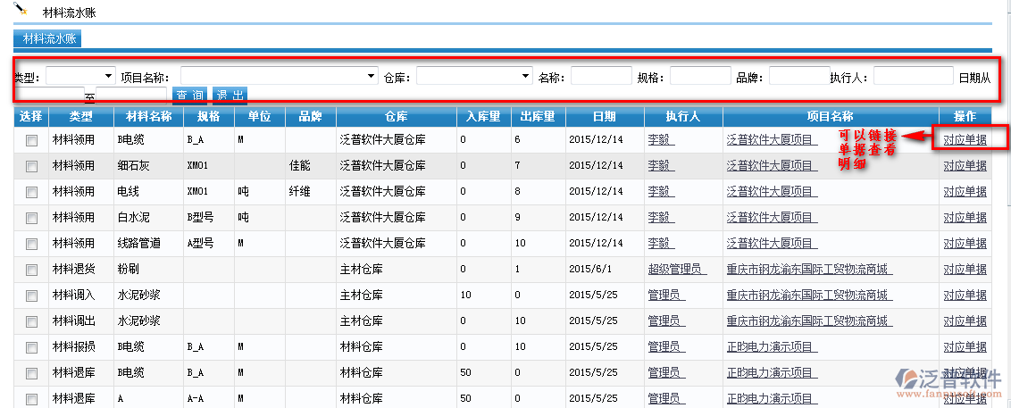 材料流水(選擇查詢條件查看材料流水)