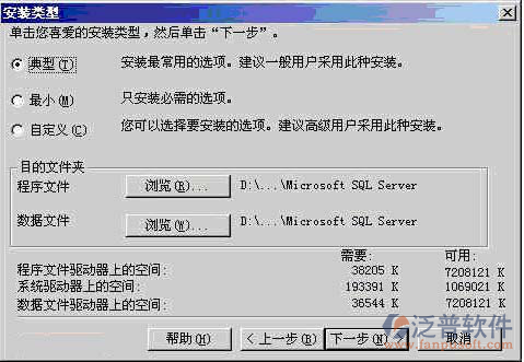 在 【安裝類型】 窗口,選擇【典型】 安裝選項(xiàng),并指定 【目的文件夾】。程序和數(shù)據(jù)文件的默認(rèn)安裝位置都是 "C:Program FilesMicrosoft SQL。筆者因?yàn)镃盤是系統(tǒng)區(qū)、D盤是應(yīng)用區(qū),因此選擇了D盤。注意,如果你的數(shù)據(jù)庫數(shù)據(jù)有10萬條以上的話,請(qǐng)至少預(yù)留1G的存儲(chǔ)空間,以應(yīng)付需求龐大的日志空間和索引空間。