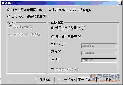 在 【服務(wù)帳戶】窗口,請(qǐng)選擇 【對(duì)每個(gè)服務(wù)使用統(tǒng)一賬戶...】 的選項(xiàng)。在 【服務(wù)設(shè)置】處,選擇【使用本地系統(tǒng)賬戶】。