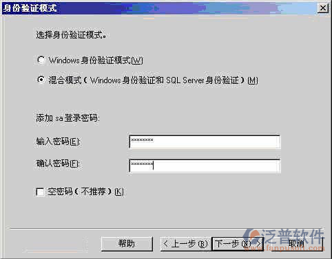 在 【身份驗(yàn)證模式】窗口,請(qǐng)選擇【混合模式..】 選項(xiàng),并設(shè)置管理員【sa】賬號(hào)的密碼。OA/E的數(shù)據(jù)庫連接密碼默認(rèn)為:sa,