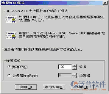 在【選擇許可模式】窗口,根據(jù)您購買的類型和數(shù)量輸入(0表示沒有數(shù)量限制)?!久靠蛻簟勘硎就粫r(shí)間最多允許的連接數(shù),【處理器許可證】表示該服務(wù)器最多能安裝多少個(gè)CPU。這里選擇了【每客戶】 并輸入了100作為示例。注:網(wǎng)絡(luò)上的共享版不用設(shè)置此步驟即可無限用戶數(shù)。