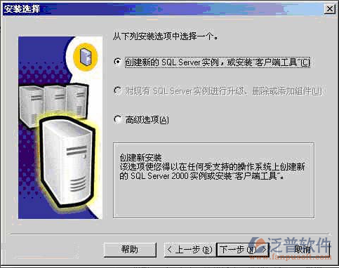 在 【安裝選擇】 窗口中選擇 【創(chuàng)建新的SQL Server實(shí)例...】。對(duì)于初次安裝的用戶,應(yīng)選用這一安裝模式,不需要使用 【高級(jí)選項(xiàng)】 進(jìn)行安裝。 【高級(jí)選項(xiàng)】 中的內(nèi)容均可在安裝完成后進(jìn)行調(diào)整。