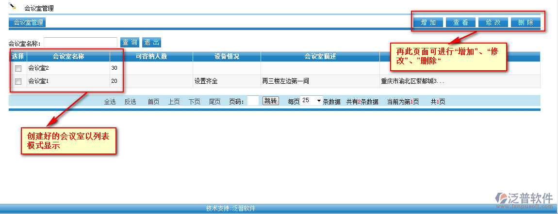 創(chuàng)建完后的會(huì)議室主要以列表的模式顯示,可通過會(huì)議室名稱進(jìn)行模糊查詢