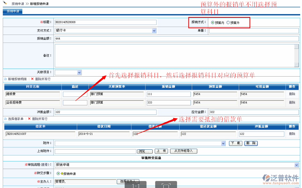 (1)發(fā)起費(fèi)用報(bào)銷流程的時(shí)候可以選取預(yù)算科目進(jìn)行報(bào)銷使用,如果報(bào)銷售金額大于預(yù)算金額,提交流程的時(shí)候會(huì)有相應(yīng)的提示;報(bào)銷流程審核通過之后,相關(guān)預(yù)算科目會(huì)增加使用記錄,而且可用預(yù)算金額會(huì)相應(yīng)減少,減少金額等于報(bào)銷金額;