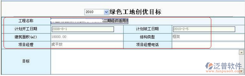 綠色工地創(chuàng)優(yōu)目標(biāo):本模塊也是按年度登記綠色工地創(chuàng)優(yōu)目標(biāo),如下圖所示,紅色框選的字段自動(dòng)從該工程基本信息中自動(dòng)獲取,在此只需填寫 “目標(biāo)”欄信息。