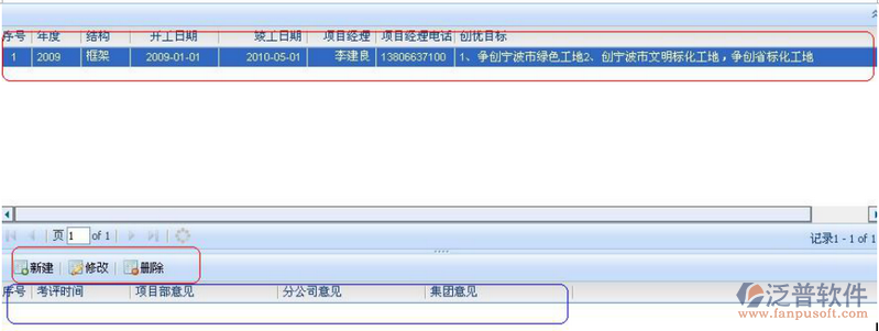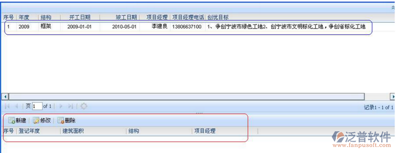 安全創(chuàng)優(yōu)工地登記:針對(duì)具體項(xiàng)目和創(chuàng)優(yōu)目標(biāo)進(jìn)行已創(chuàng)優(yōu)工地的登記。如下圖所示,選中上面紅色框選的創(chuàng)優(yōu)目標(biāo)項(xiàng),點(diǎn)擊下邊藍(lán)色圈選的新建按鈕即可登記,點(diǎn)擊修改、刪除按鈕可對(duì)已登記的創(chuàng)優(yōu)記錄進(jìn)行相應(yīng)的操作。