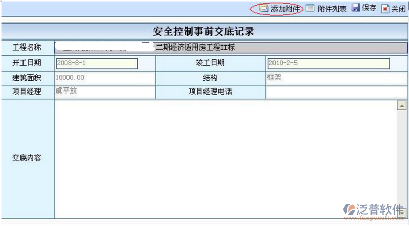 安全控制事前交底記錄:登記界面如下圖所示。交底內(nèi)容中可填寫交底事項(xiàng)的大綱,具體內(nèi)容可以點(diǎn)擊下圖右上角紅色圈選的“添加附件”按鈕添加。