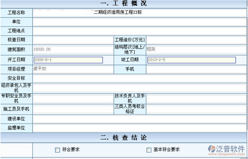 開工安全生產(chǎn)條件檢查:界面如下圖所示,工程概況中的記錄為自動(dòng)帶出來(lái)的類容,核查結(jié)論需根據(jù)實(shí)際檢查結(jié)果來(lái)判定。