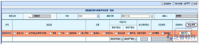 集團(tuán)年度危險(xiǎn)源辨識(shí)和風(fēng)險(xiǎn)評(píng)價(jià),如下圖所示,點(diǎn)擊紅色圈選的“危險(xiǎn)源庫(kù)”按鈕可調(diào)用庫(kù)中的模板,下面會(huì)出現(xiàn)紅色底紋顯示的選項(xiàng),勾選要評(píng)價(jià)的項(xiàng)目點(diǎn)擊藍(lán)色框選的“確定導(dǎo)入”按鈕,下面可對(duì)顯示選中項(xiàng)進(jìn)行評(píng)價(jià)。