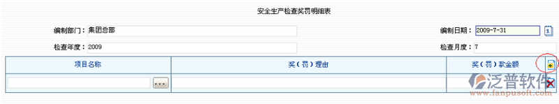 項(xiàng)目安全獎(jiǎng)罰明細(xì)、企業(yè)安全獎(jiǎng)罰明細(xì),界面如下圖所示,點(diǎn)擊下圖紅色圈住的按鈕可增加獎(jiǎng)罰項(xiàng)目。
