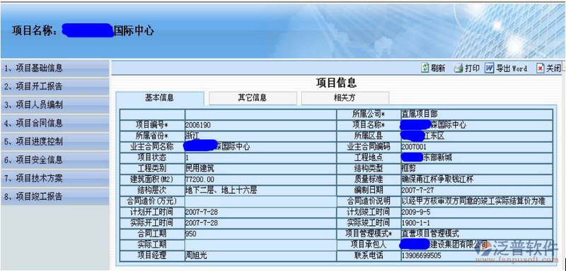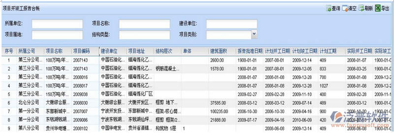 工程基本信息臺帳:查詢在建工程信息情況。此處信息取自業(yè)主合同登記中的工程信息。查詢界面如下圖所示: