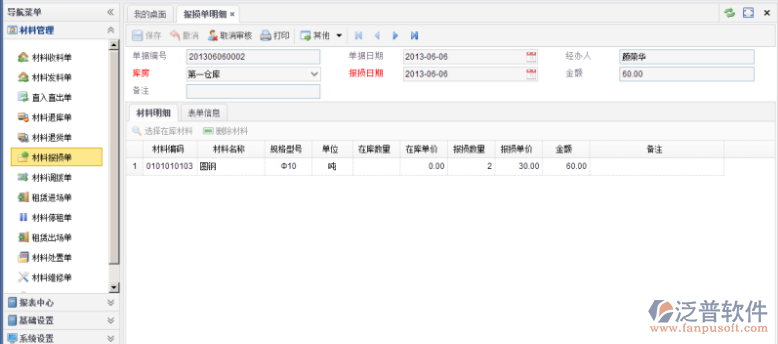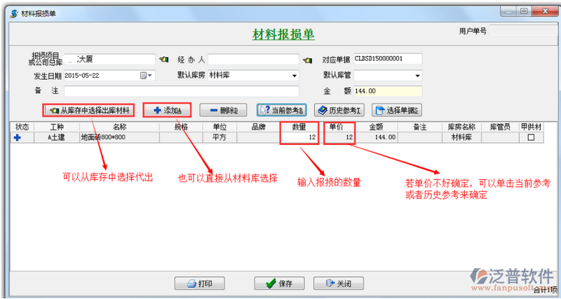 【材料報損單】用來記錄材料的在領(lǐng)料之前的損耗或丟失。從入庫到真正使用之前,材料有可能發(fā)生損耗或丟失,還有可能材料在領(lǐng)走前沒有保管好導(dǎo)致?lián)p壞。雖然材料的成本已計入工程的費用總額,但還是需要記錄跟蹤材料的真實流向,以便確定工程的實際使用量及某一時間的材料庫存量。錄入本單據(jù)前,需先錄入要用到基礎(chǔ)信息中的【材料維護】、【項目維護】(包括【庫房信息】) 。
