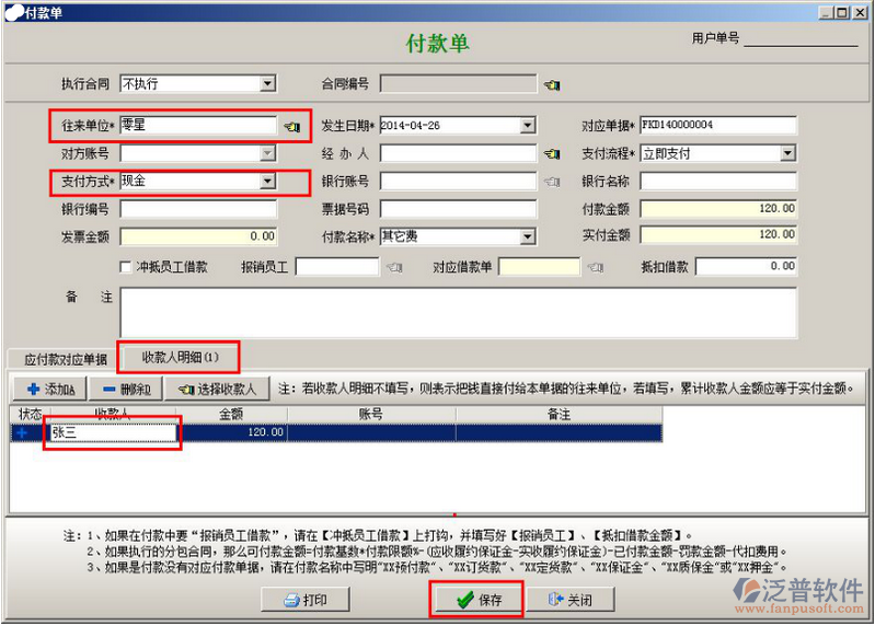 (5)因為錢是直接給的員工,所以在做【付款申請單】或【付款單】時,注意“收款人明細(xì)”中寫名收款為墊付的員工。往來單位要寫明真實單位,如果是不具名的單位,可以提前在基礎(chǔ)信息的【往來單位維護】中添加一個名稱為“零星”的單位,統(tǒng)一處理類似費用的支出。如下圖: