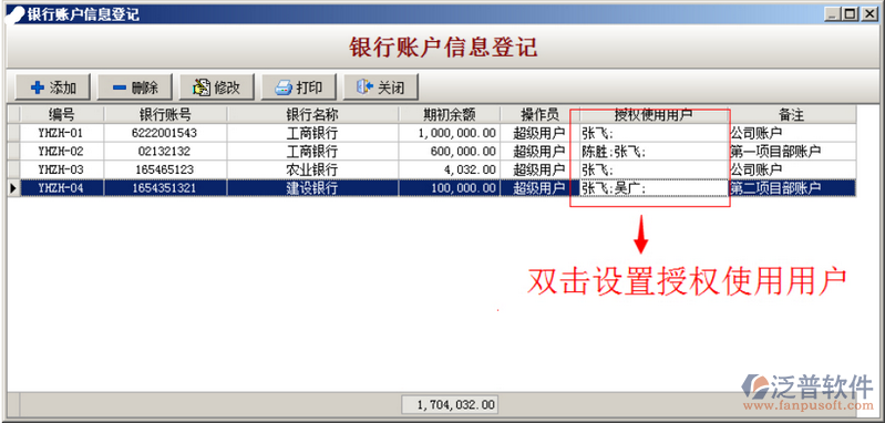 (1)讓超級(jí)用戶或總公司財(cái)務(wù)經(jīng)理在期初使用軟件時(shí),在軟件的主菜單中【財(cái)務(wù)】->【銀行管理】->【銀行賬戶信息登記】中建立總公司賬戶和項(xiàng)目部(或子公司)賬戶,其中總公司銀行賬戶的授權(quán)使用人要設(shè)置為總公司的相關(guān)財(cái)務(wù)人員和總經(jīng)理,項(xiàng)目部(或子公司)賬戶的授權(quán)使用人要設(shè)置為總公司和該項(xiàng)目部(或子公司)的相關(guān)財(cái)務(wù)人員和經(jīng)理,這樣總公司人員不但能查詢總公司的銀行資金流水還能監(jiān)控到各項(xiàng)目部的流水,項(xiàng)目部(或子公司)只能查看自己的資金流水。如下圖: