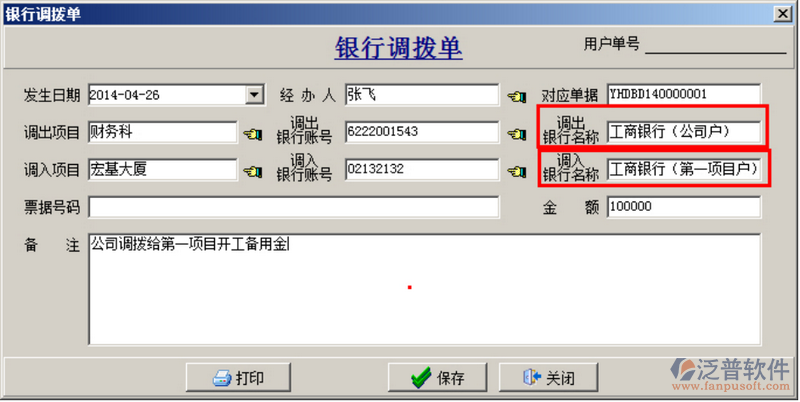 (3)公司給項(xiàng)目部(或子公司)撥款做【銀行調(diào)撥單】,其中調(diào)出銀行為總公司的銀行賬號(hào),調(diào)入銀行為項(xiàng)目部(或子公司)的銀行賬號(hào),如下圖: