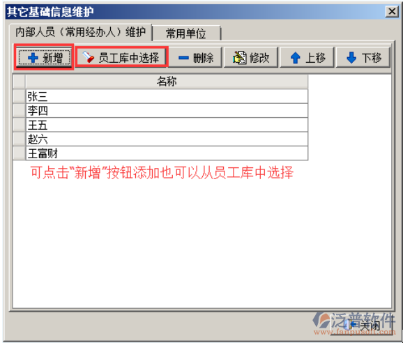 “其它信息維護”是用來登記“常用內(nèi)部人員”。點擊系統(tǒng)菜單欄“基礎(chǔ)信息”-“其他基本信息維護”彈出“其他基本信息維護”的對話框,如圖: