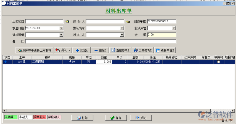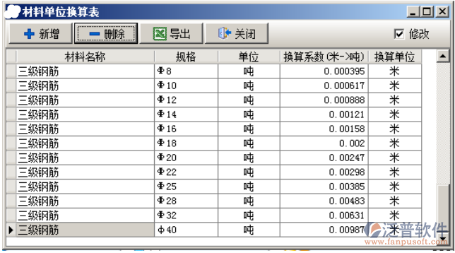 “材料單位換算表”用來登記材料單位換算。如下圖: