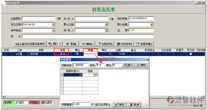 使用方法:在單據(jù)中,選擇需要換算單位材料的數(shù)量,按鍵盤上的Ctrl+Enter鍵盤彈出單位材料換算表,輸入數(shù)量及長度按確定按鈕。如下圖:
